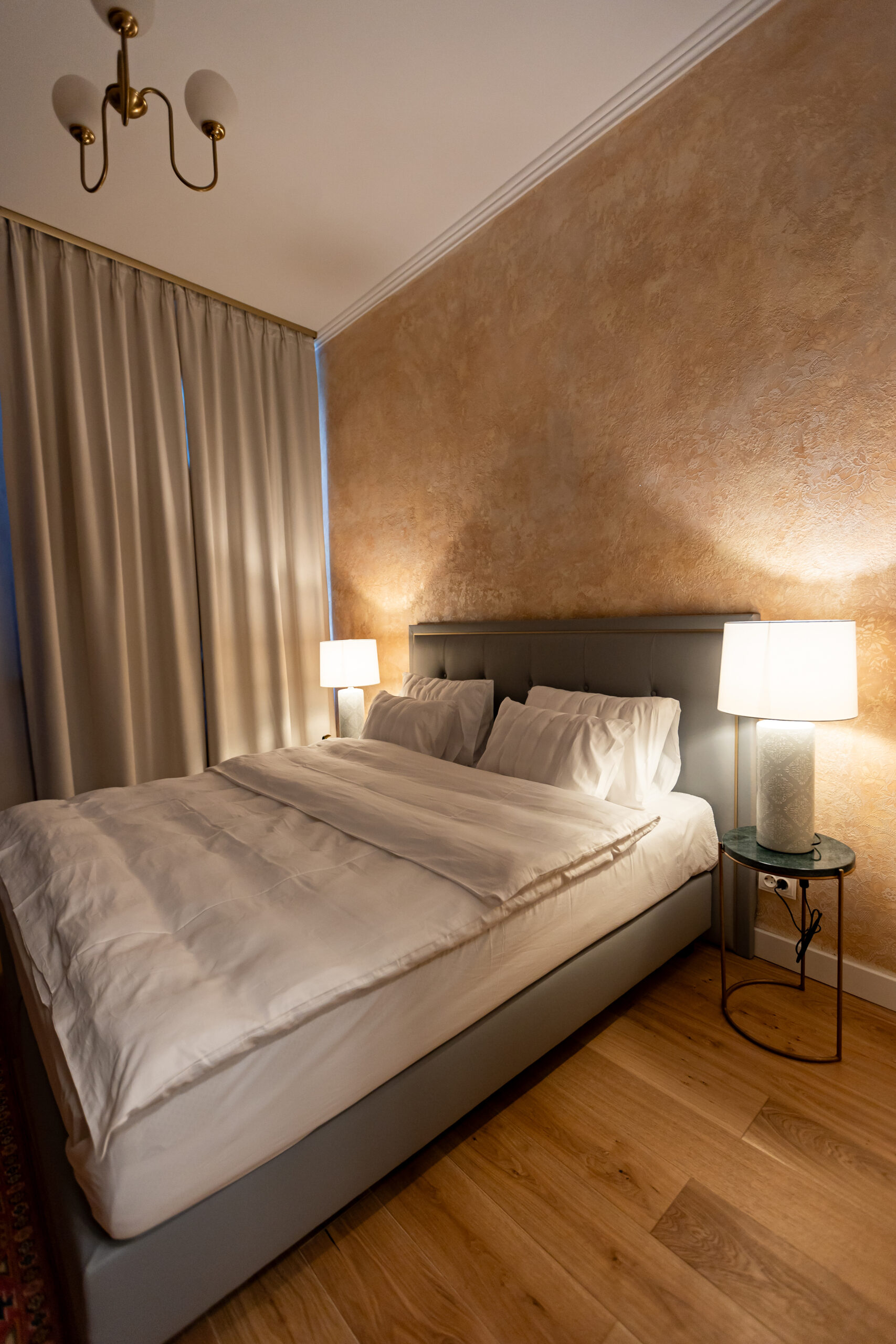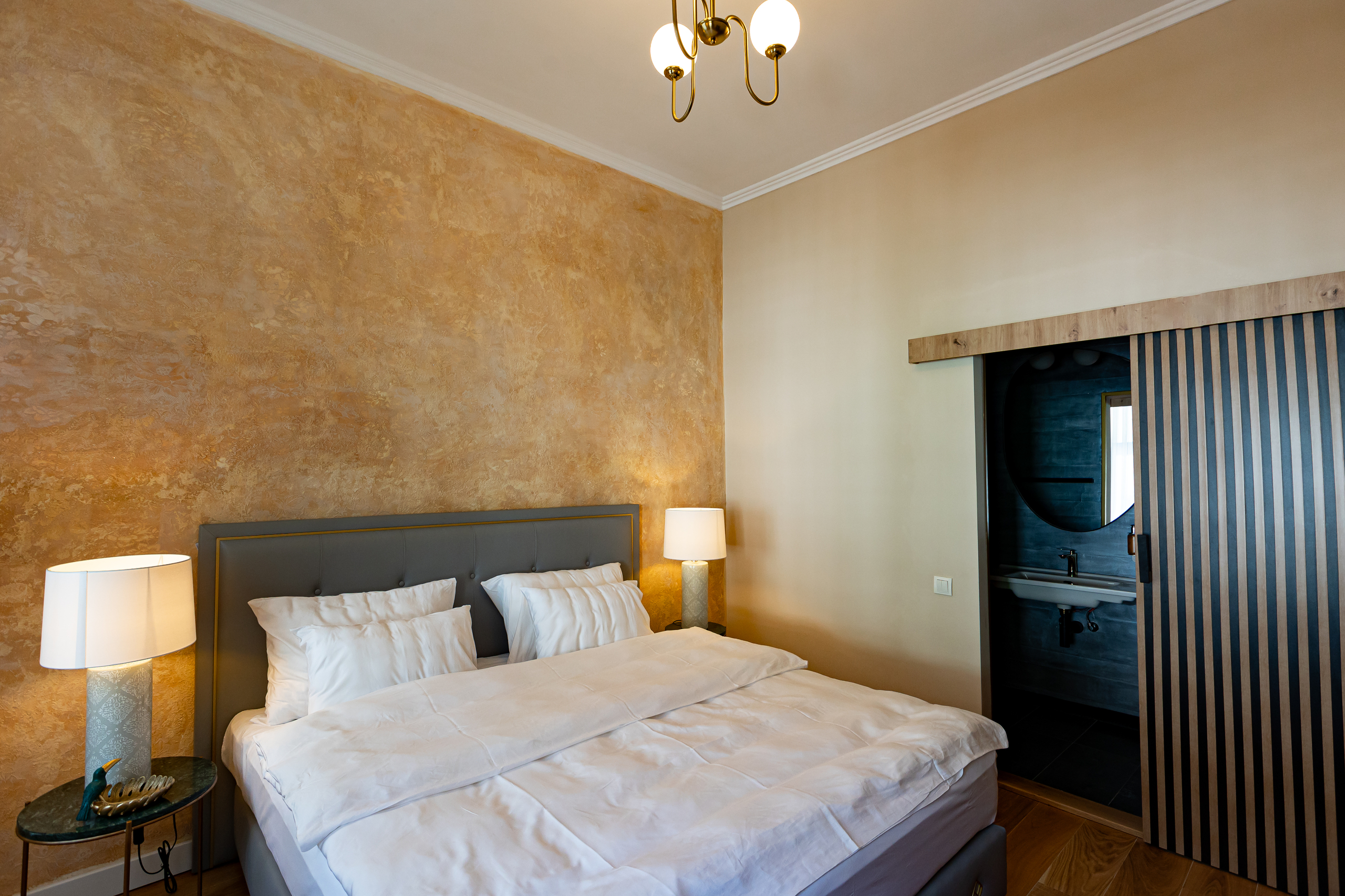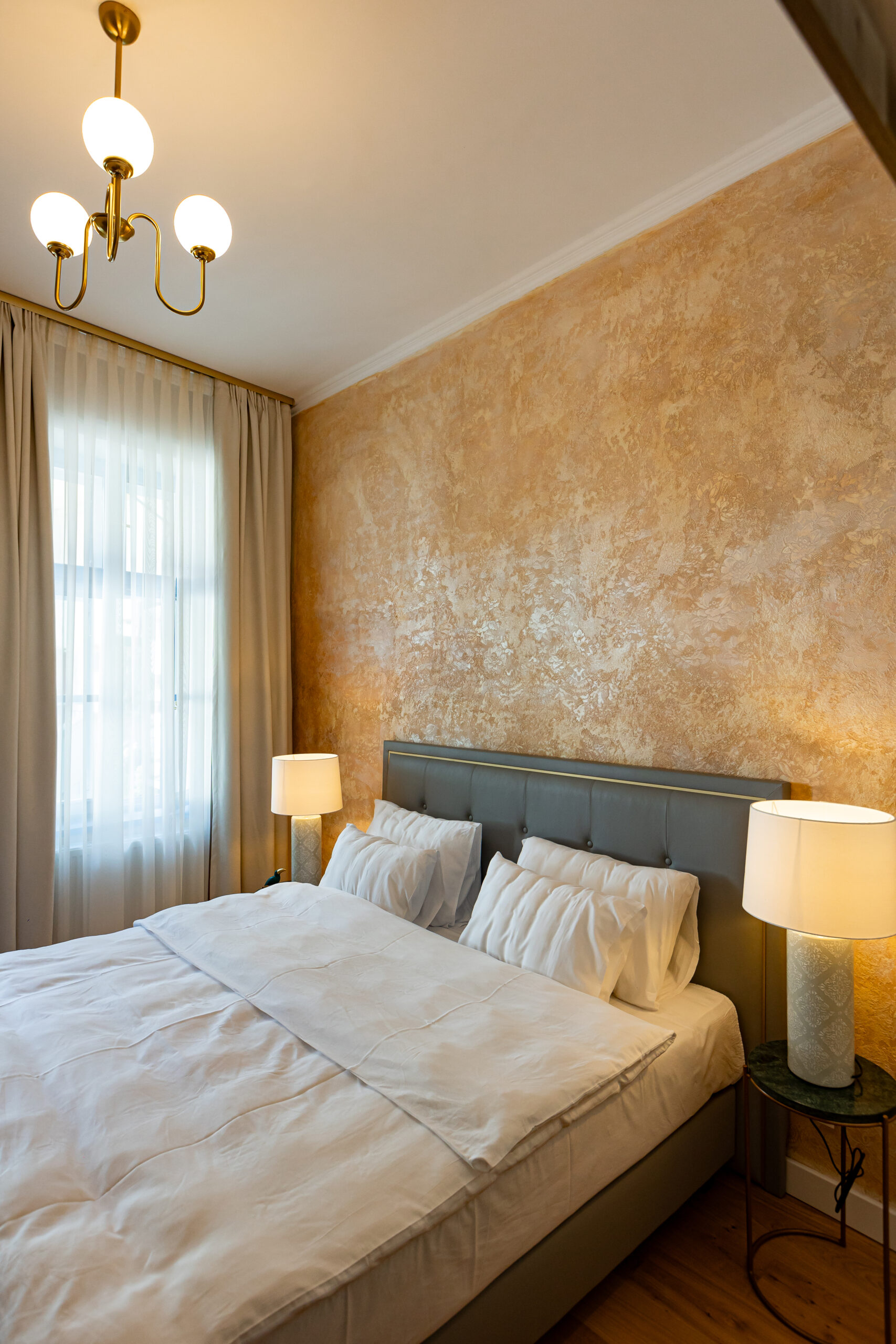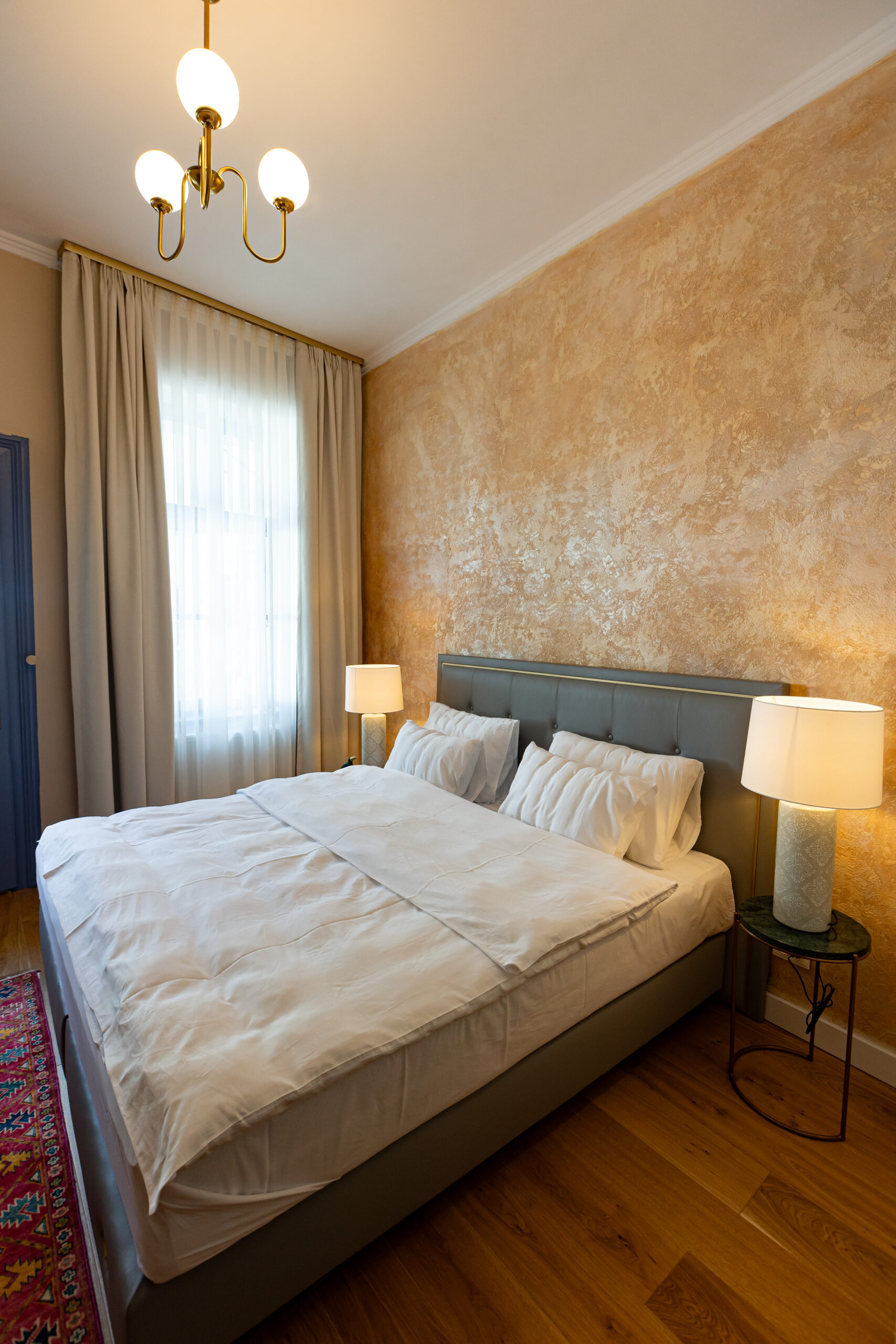 Peretele de accent cu forme și texturi ușor aurite oferă o notă de eleganță, iar draperiile black-out îți permit să dormi atât cât îți cade bine. Covorul oriental Kazak din lână, lucrat manual, noptierele cu blat de marmură, parchetul din lemn masiv și corpurile de iluminat nonconformiste completează povestea spațiului.