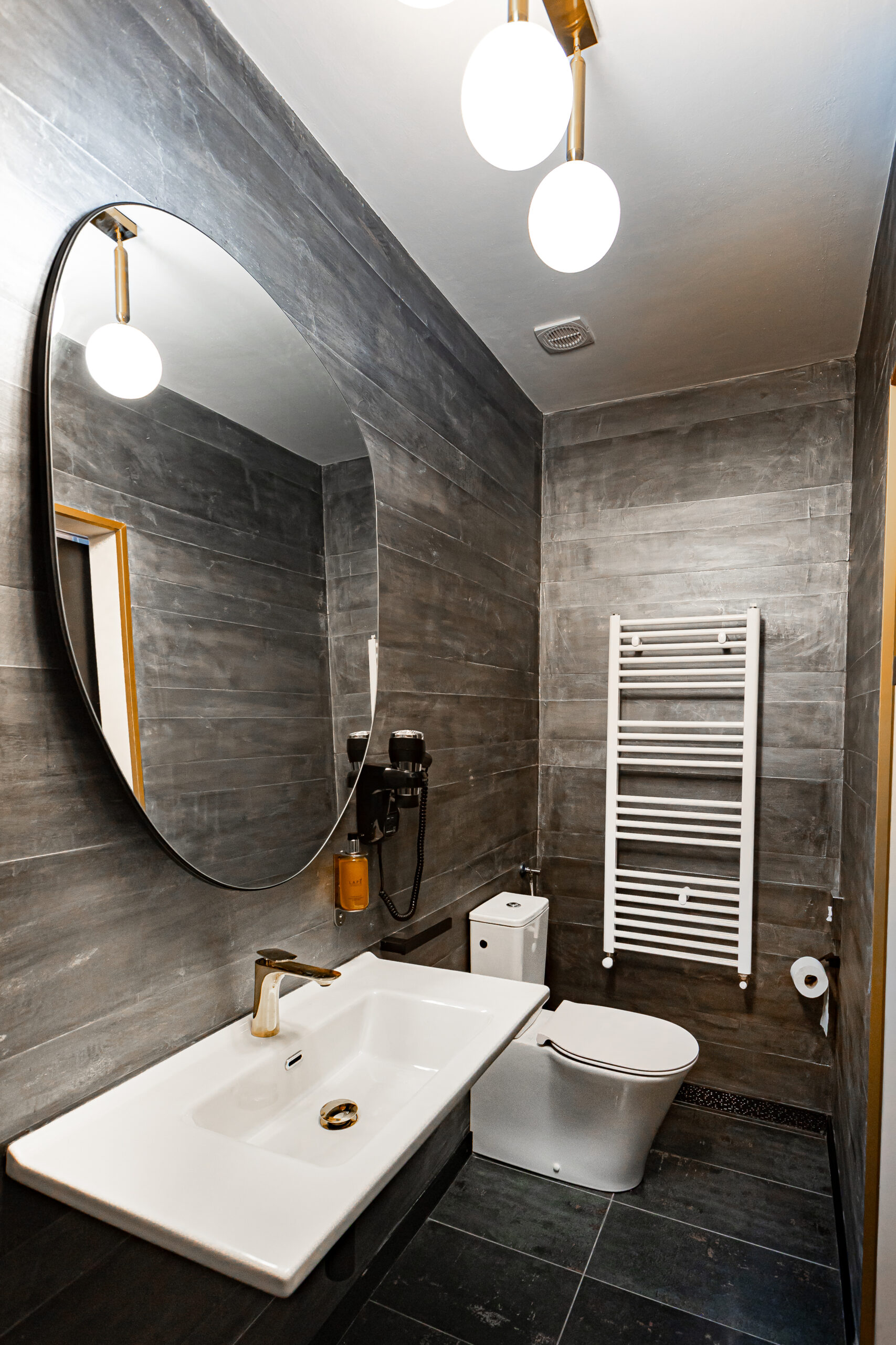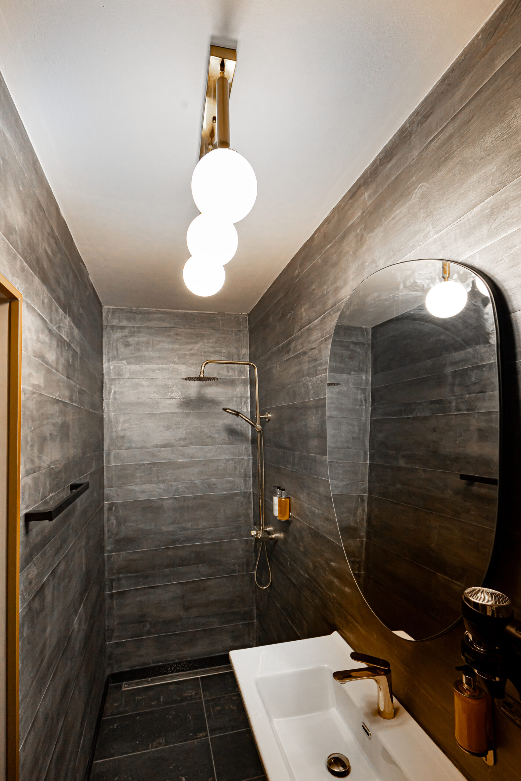Ușa cu un design deosebit te conduce într-o baie cochetă, dotată cu duș walk in, uscător de păr și prosoape imaculate.