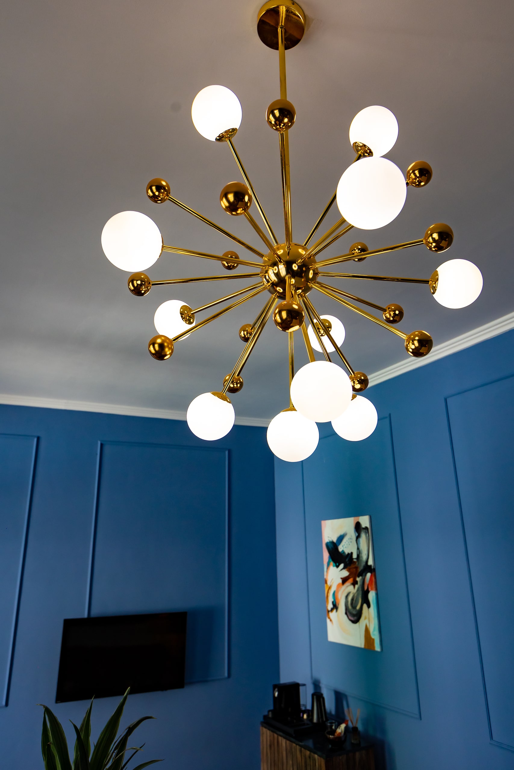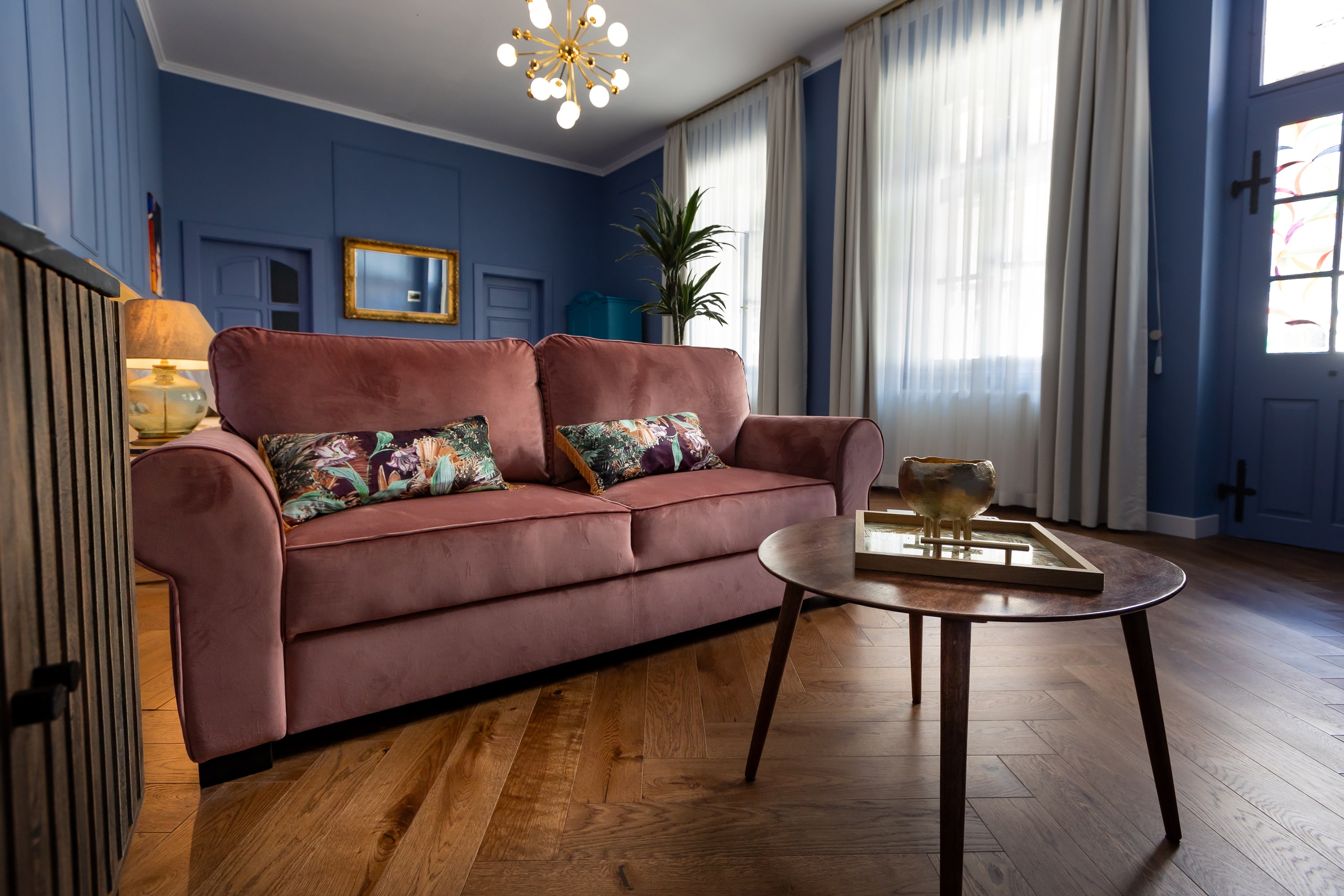 Ușa vopsită într-o nuanță de violet-amethyst și sticla pictată manual, deschid calea către o încăpere înaltă și generoasă. De la intrare vei observa parchetul din lemn masiv, canapeaua de catifea roz-pudrat și măsuța elegantă de cafea, alături de aparatul Nespresso.