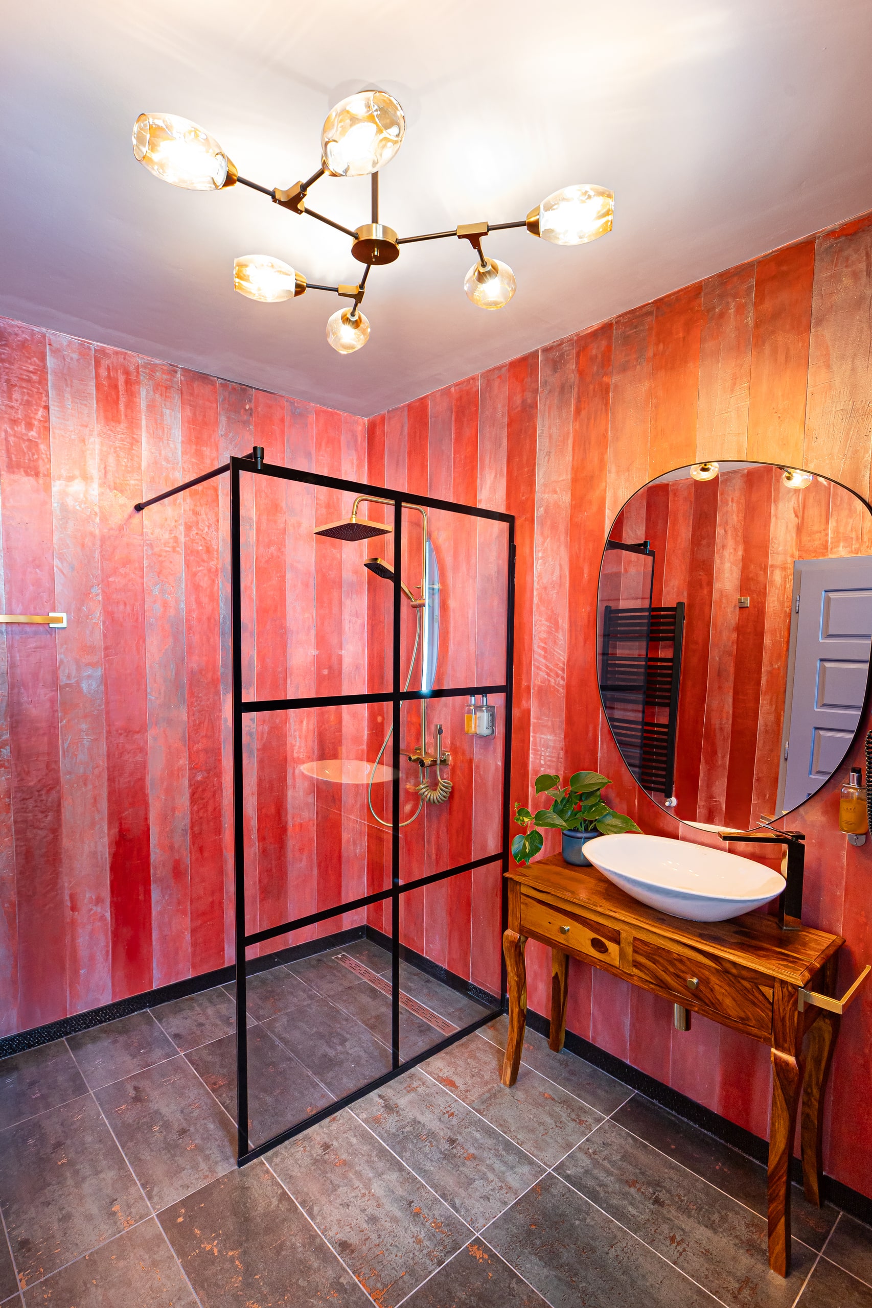 Baia zmeurie este dotată cu duș walk-in, uscător de păr și prosoape de bumbac imaculate pentru o experiență relaxantă.