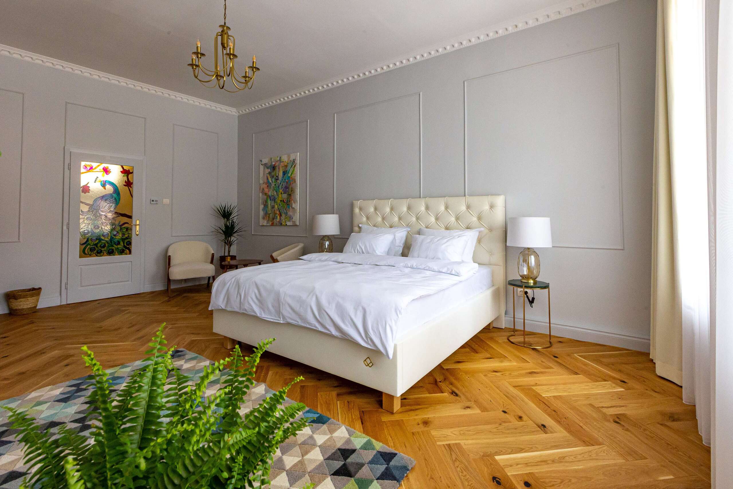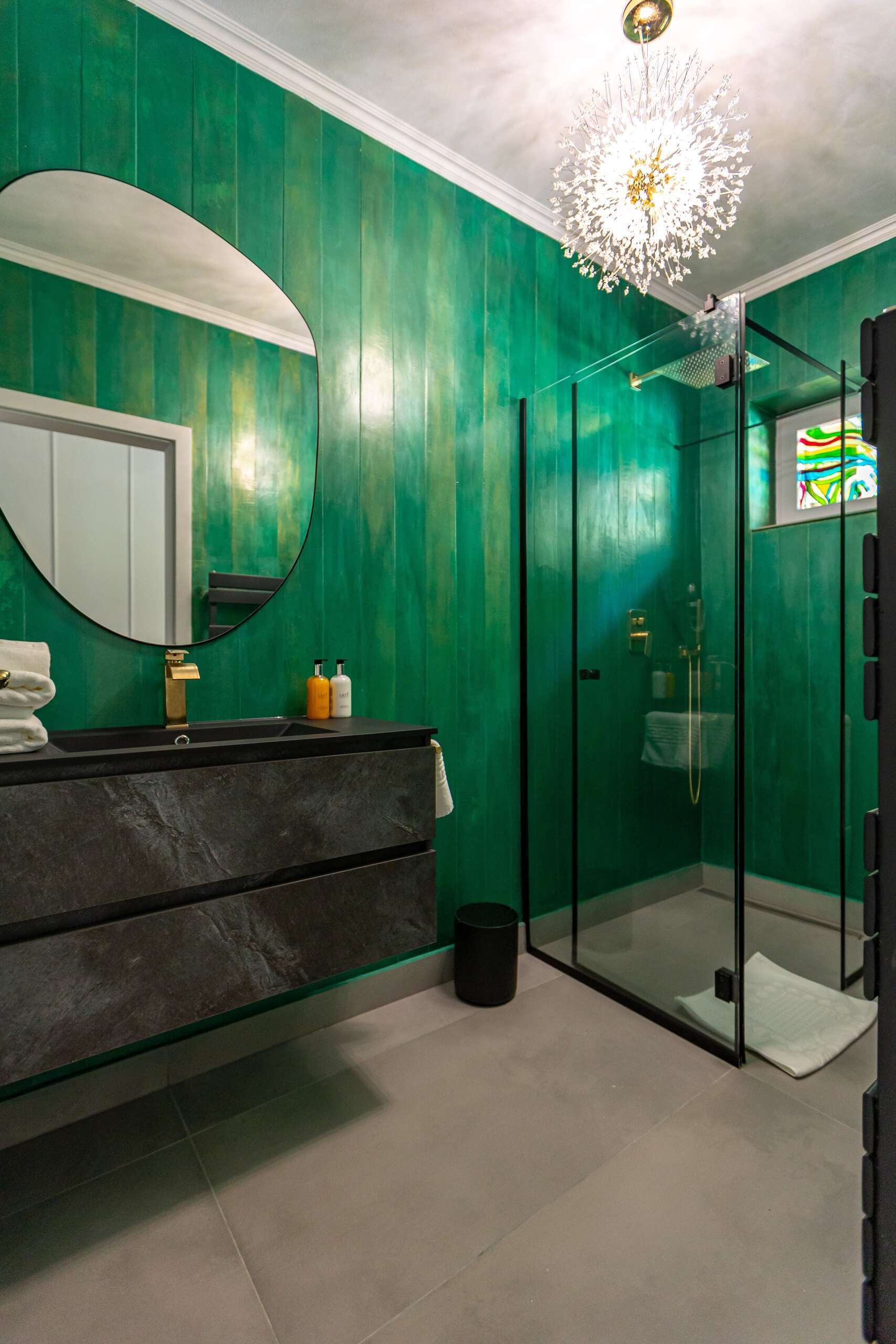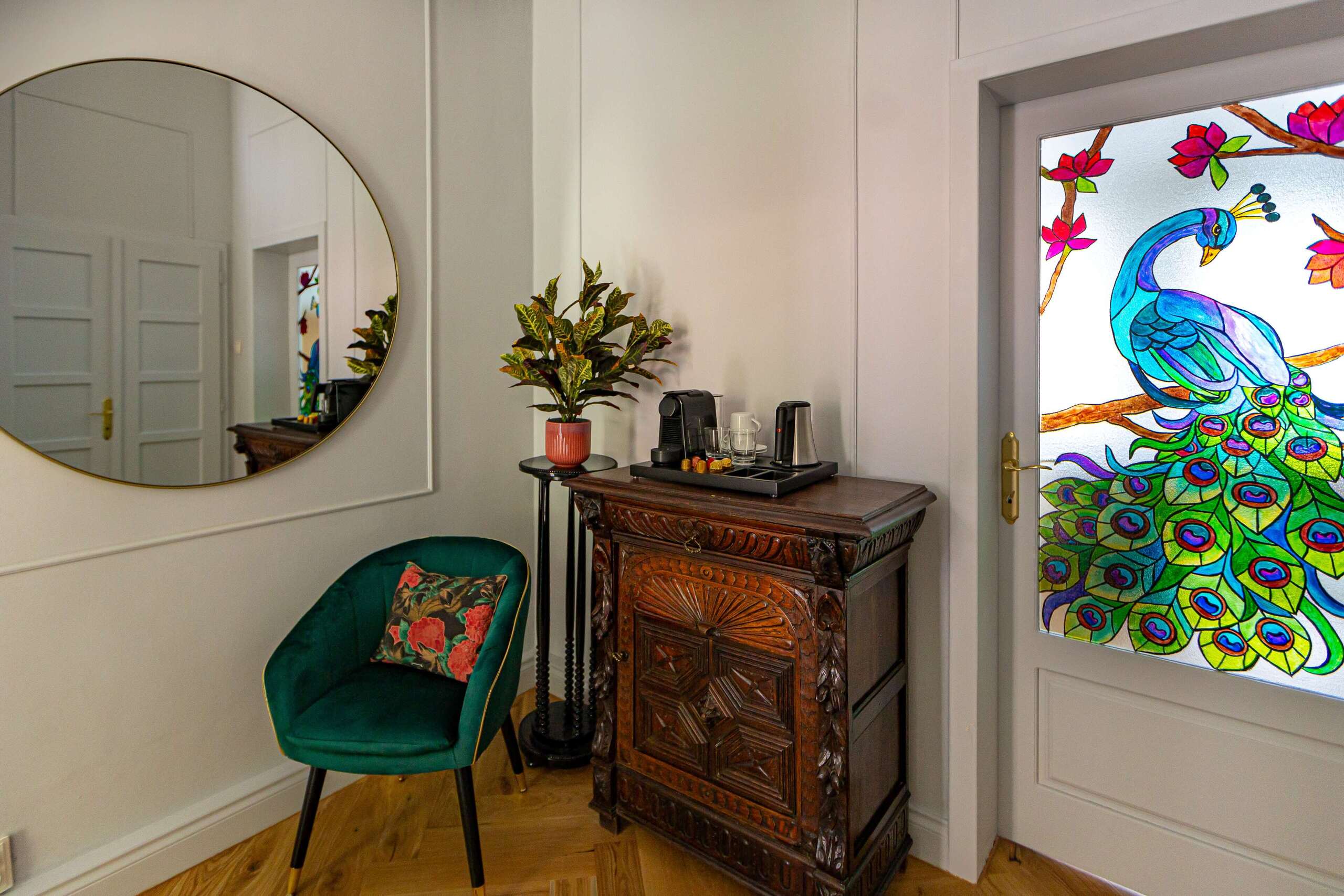 Lasă-te surprins de elemente cu animal print, un spectaculos păun pictat manual pe sticlă, mobilier din lemn masiv, noptiere din metal auriu cu marmură verde, plantele verzi dar și baia cochetă învăluită în verde smarald te îmbie la odihnă și relaxare.